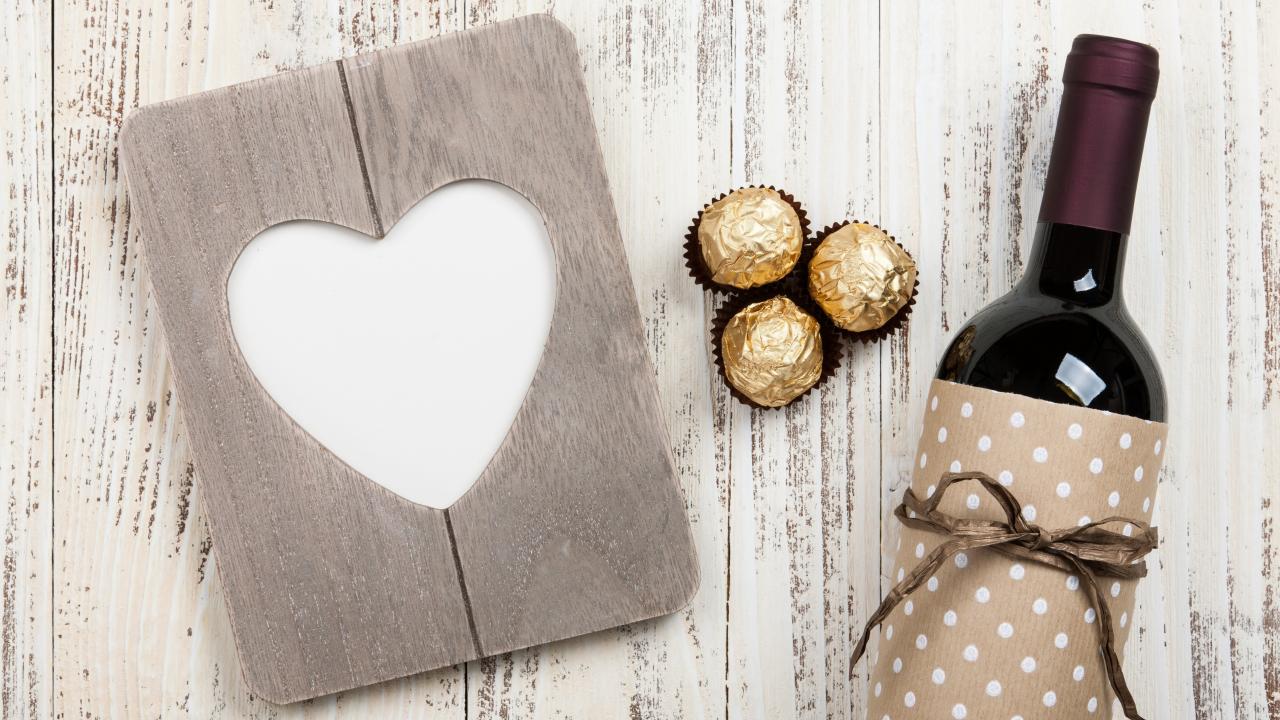 Обои Бутылка вина на столе с конфетами и сердцем