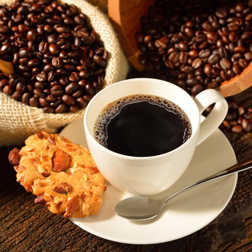 Обои Кофейные зерна на столе с белой чашкой и печеньем