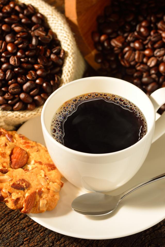 Обои Кофейные зерна на столе с белой чашкой и печеньем