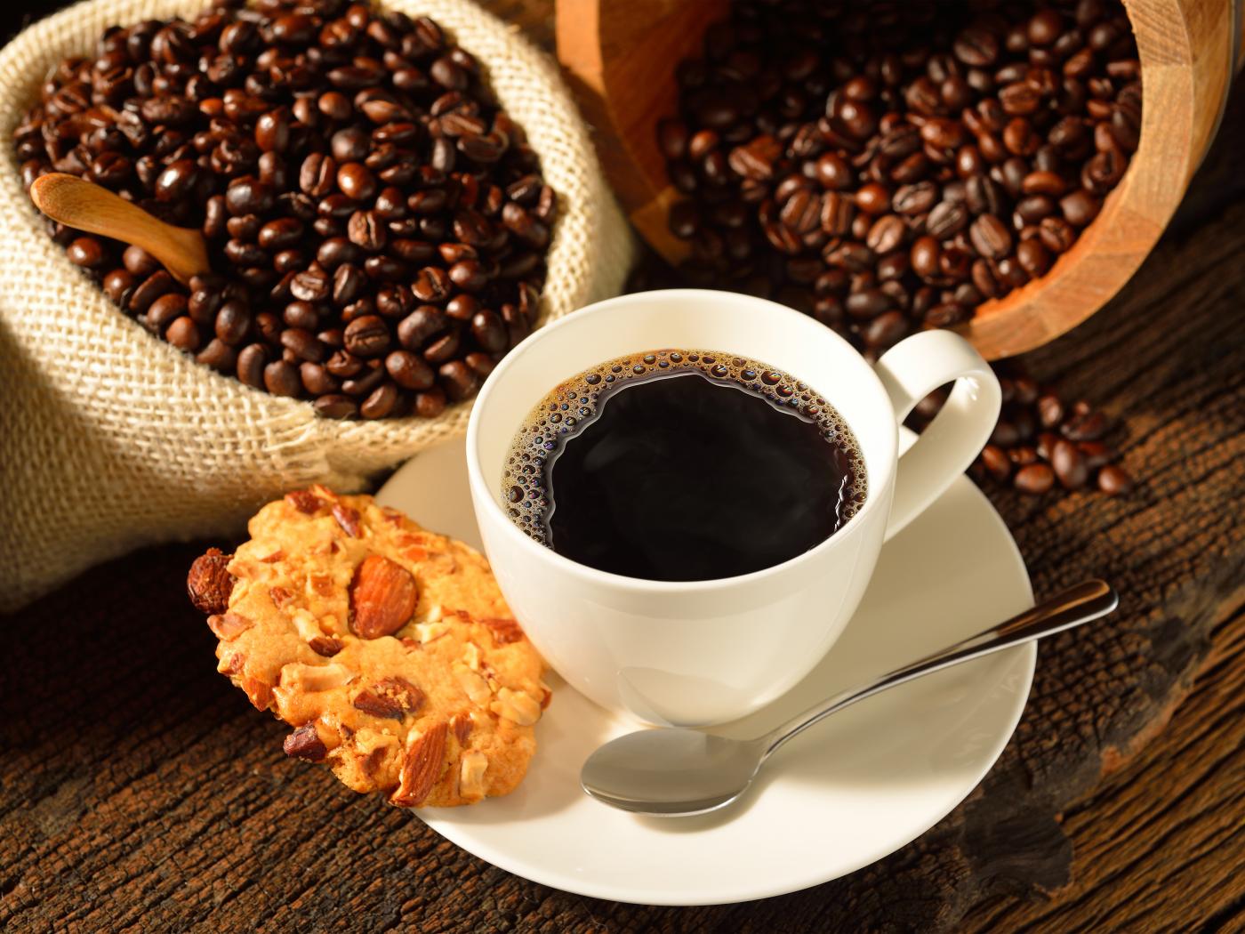 Обои Кофейные зерна на столе с белой чашкой и печеньем
