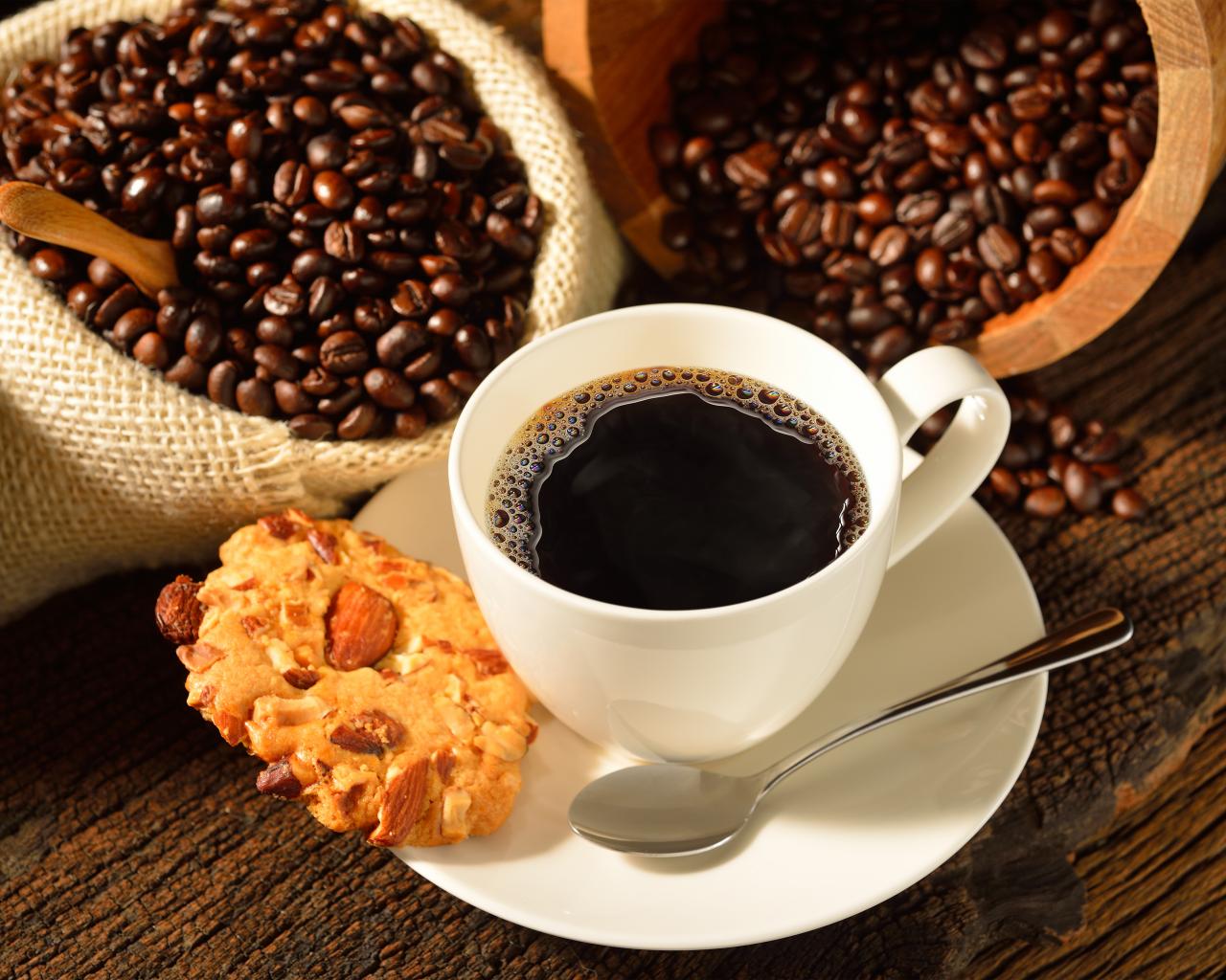 Обои Кофейные зерна на столе с белой чашкой и печеньем