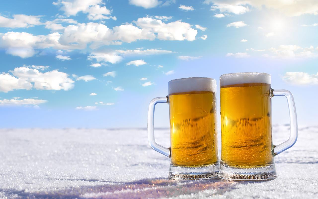 Обои Два бокала пива стоят на белом снегу под голубым небом