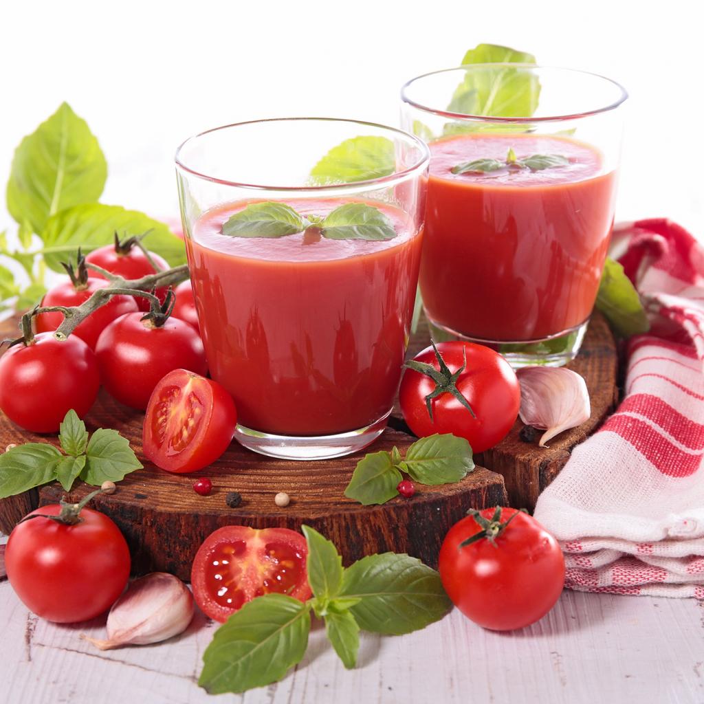 Обои Два стакана томатного сока на столе с помидорами и зеленью