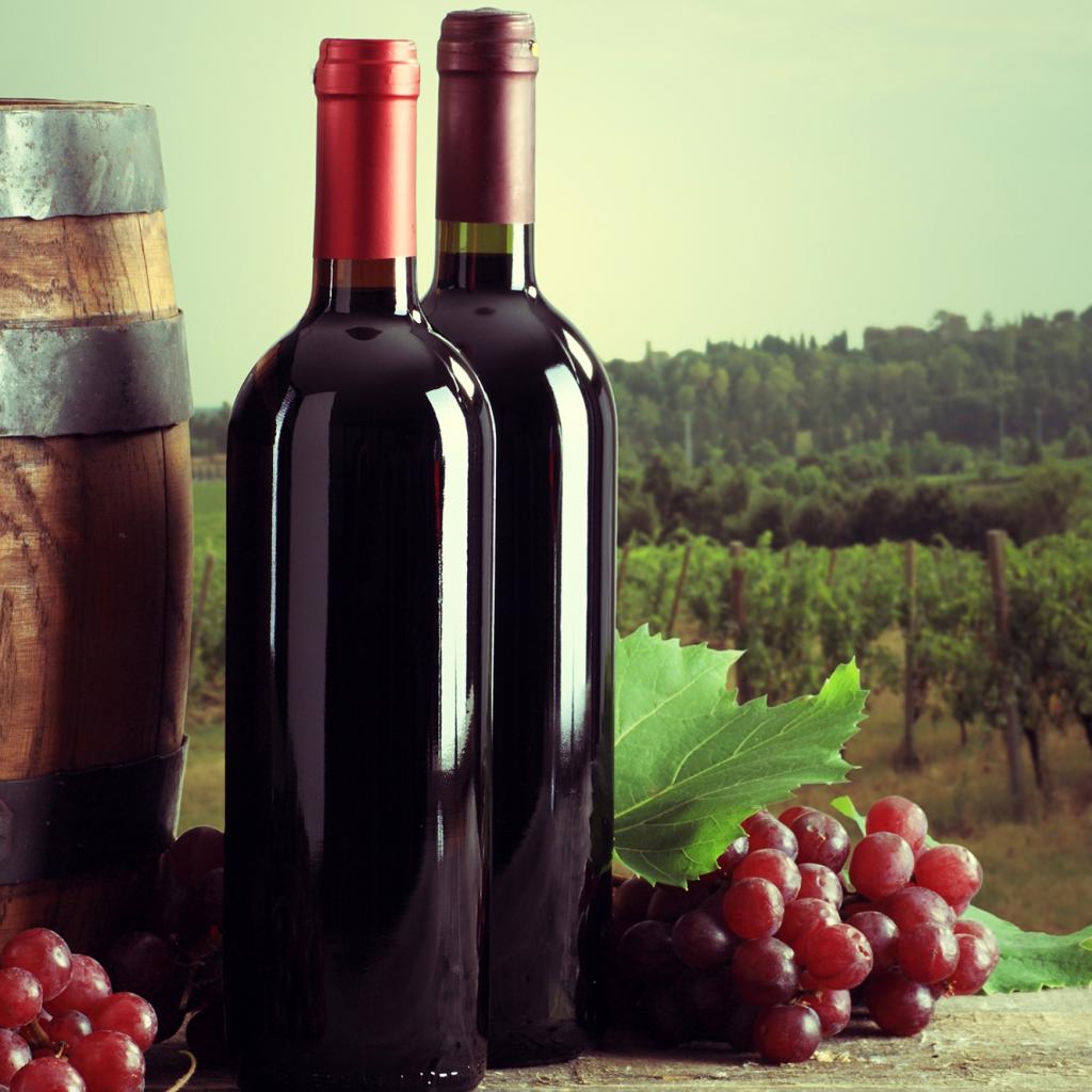 Обои Две бутылки красного вина на столе с виноградом и бочкой