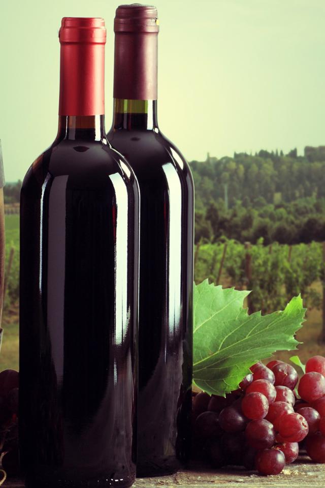 Обои Две бутылки красного вина на столе с виноградом и бочкой