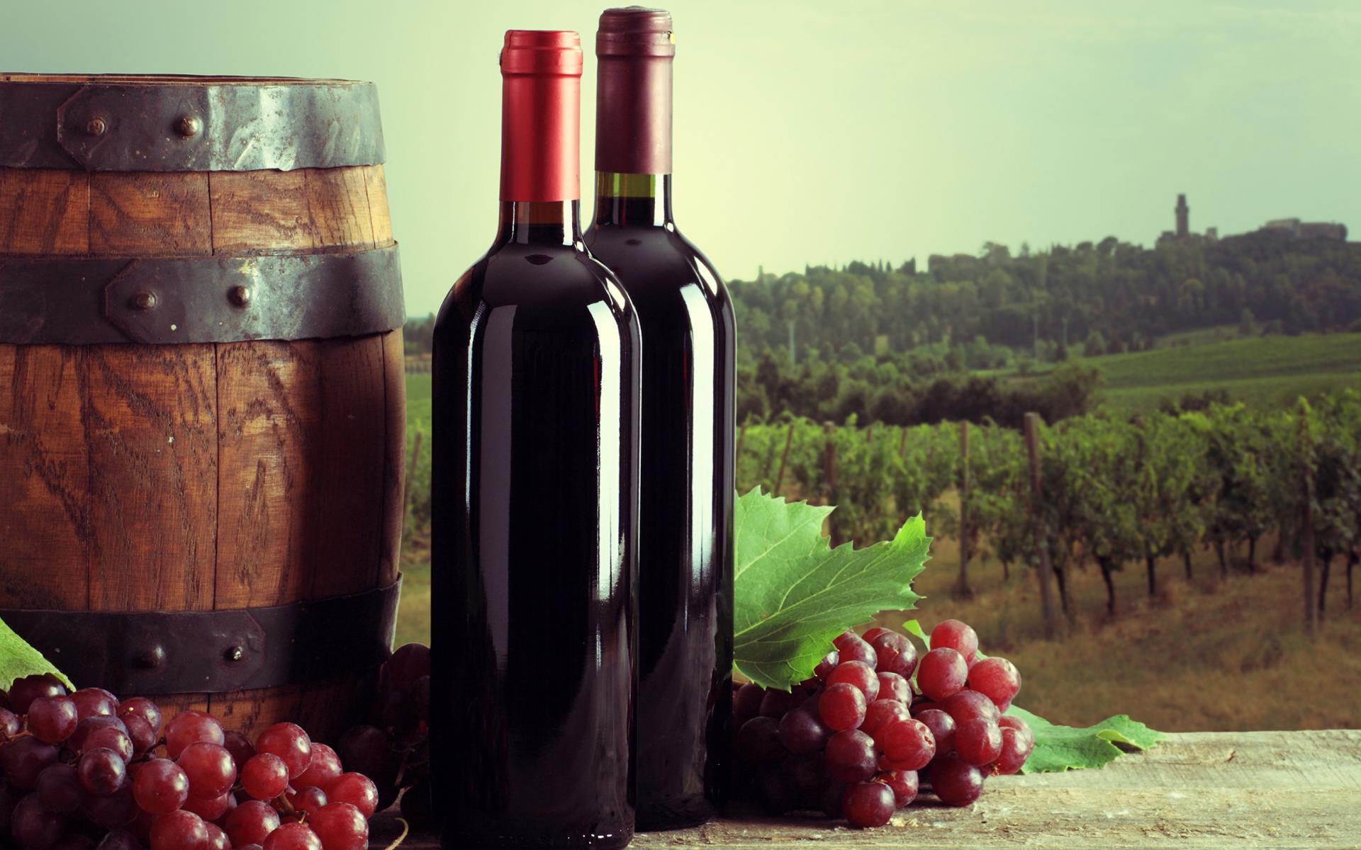 Обои Две бутылки красного вина на столе с виноградом и бочкой