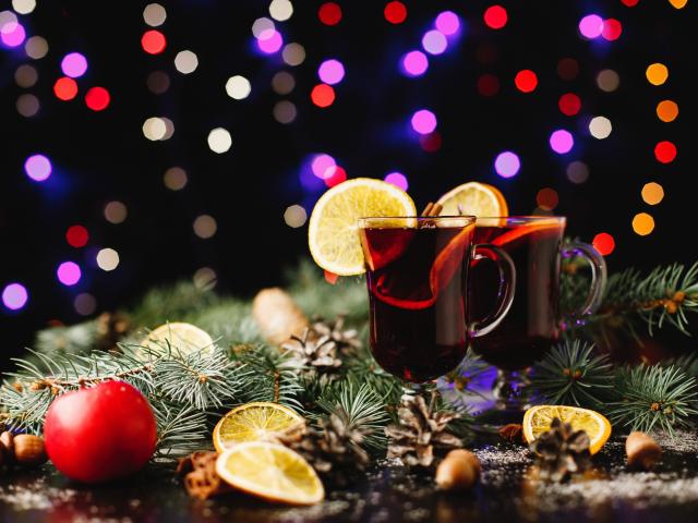 Обои Два стакана глинтвейна на столе еловыми ветками