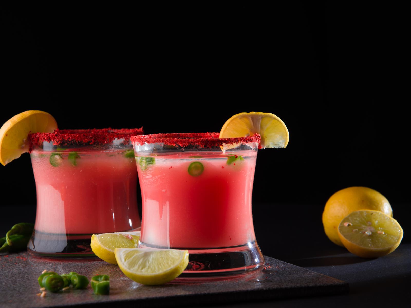 Обои Два стакана с коктейлем на черном фоне с лимоном