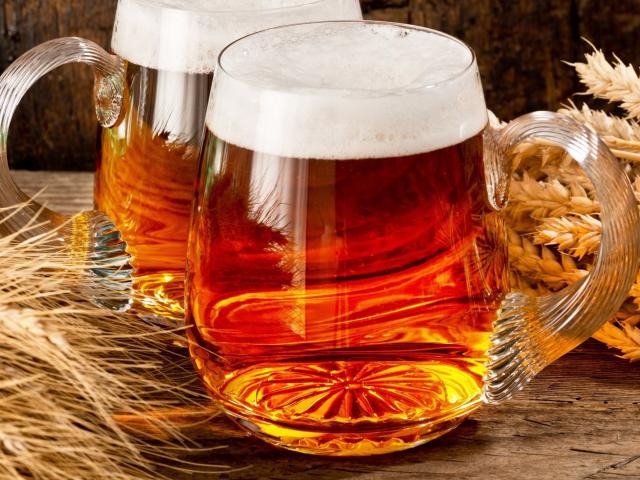 Обои Два бокала пива на столе с колосьями пшеницы