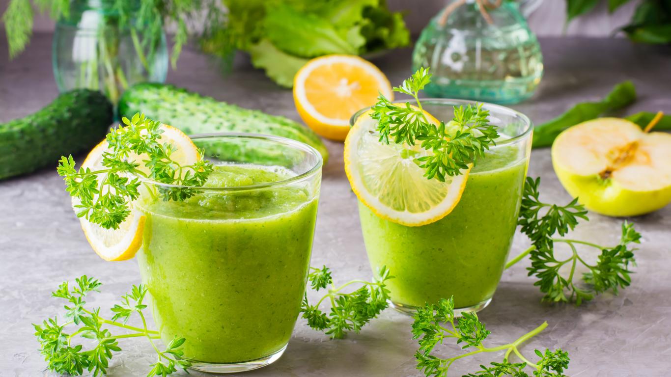 Обои Зеленый смузи в стаканах с кусочками лимона и петрушкой