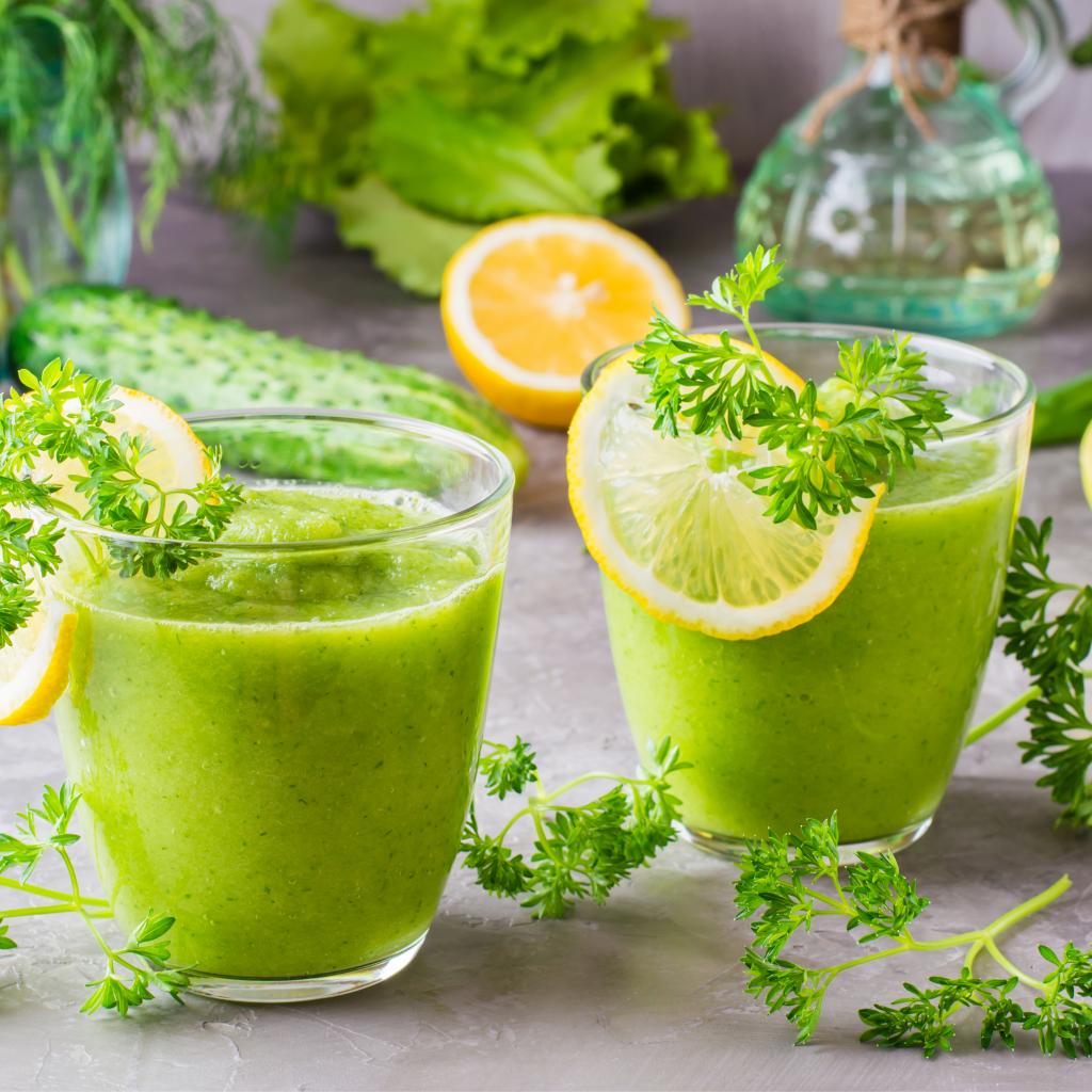 Обои Зеленый смузи в стаканах с кусочками лимона и петрушкой