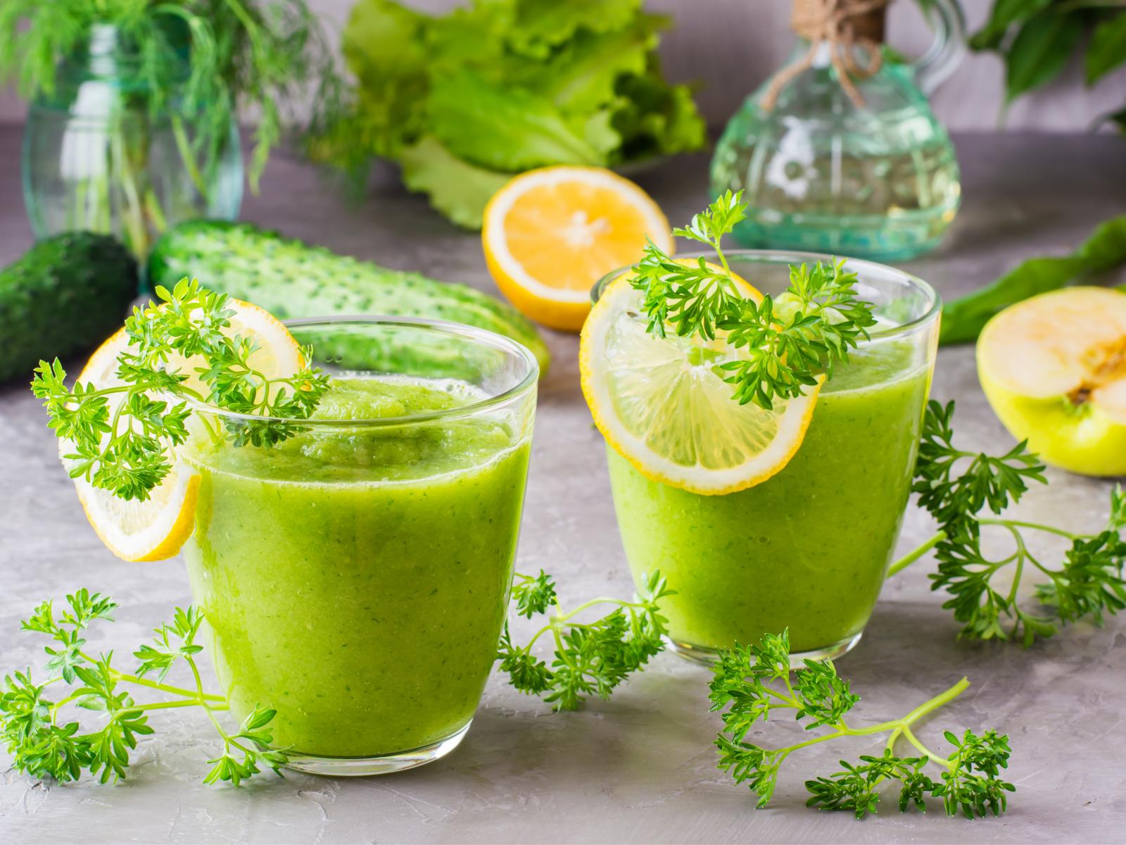 Обои Зеленый смузи в стаканах с кусочками лимона и петрушкой