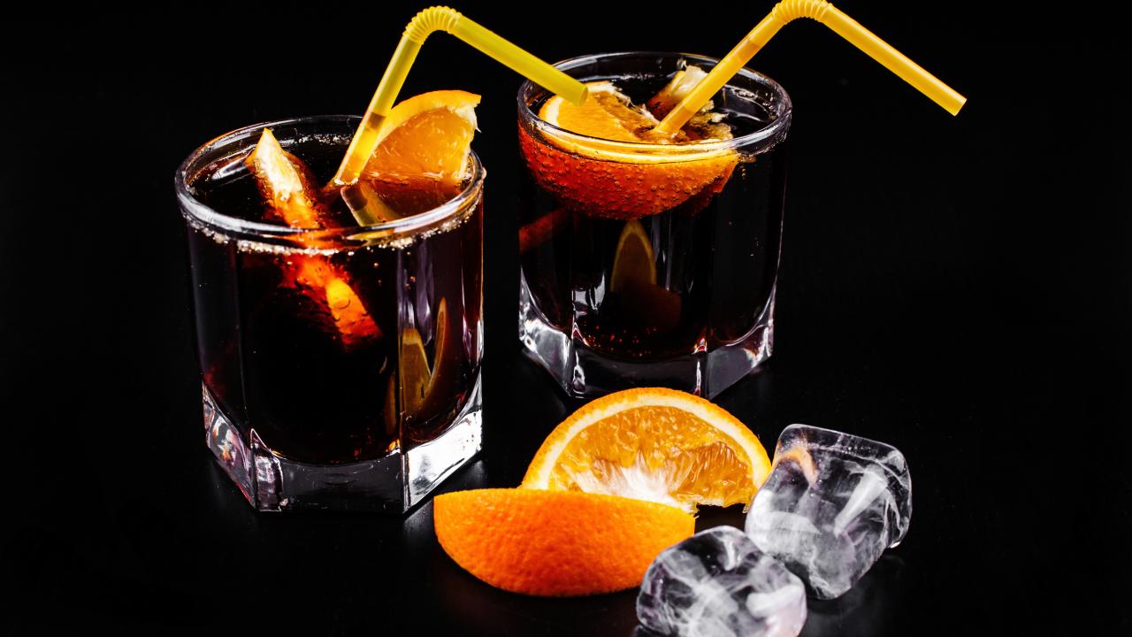 Обои Коктейль с кусочками апельсина на черном фоне со льдом
