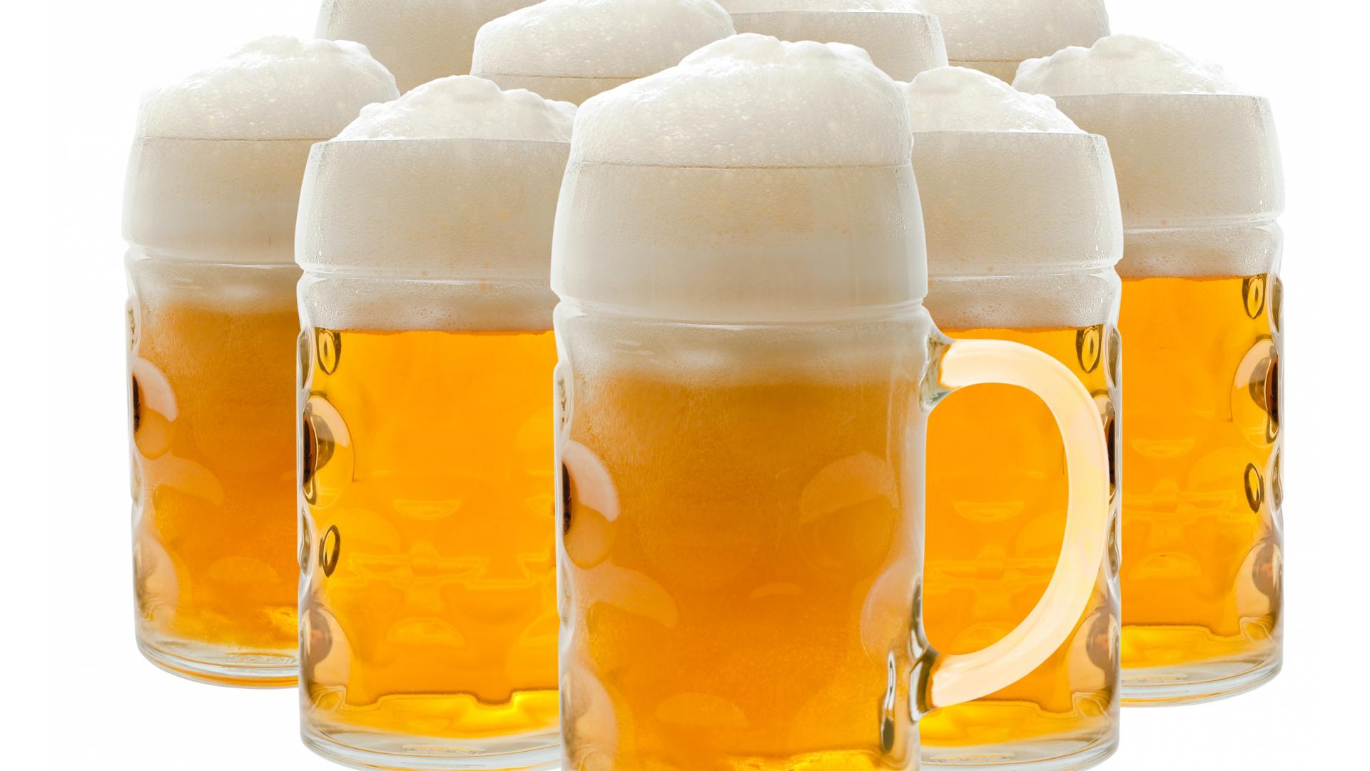 Обои Много бокалов пенного пива на белом фоне