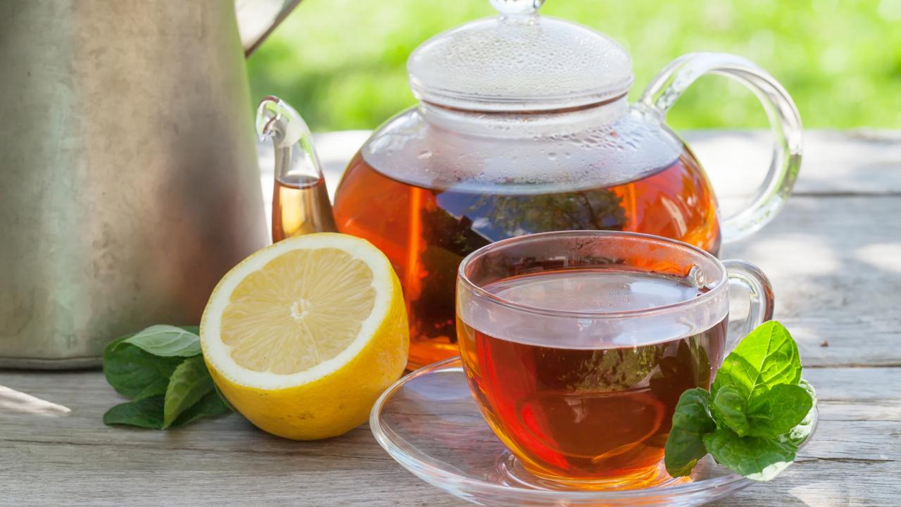 Обои Чайник с чаем на столе с чашкой и половиной лимона