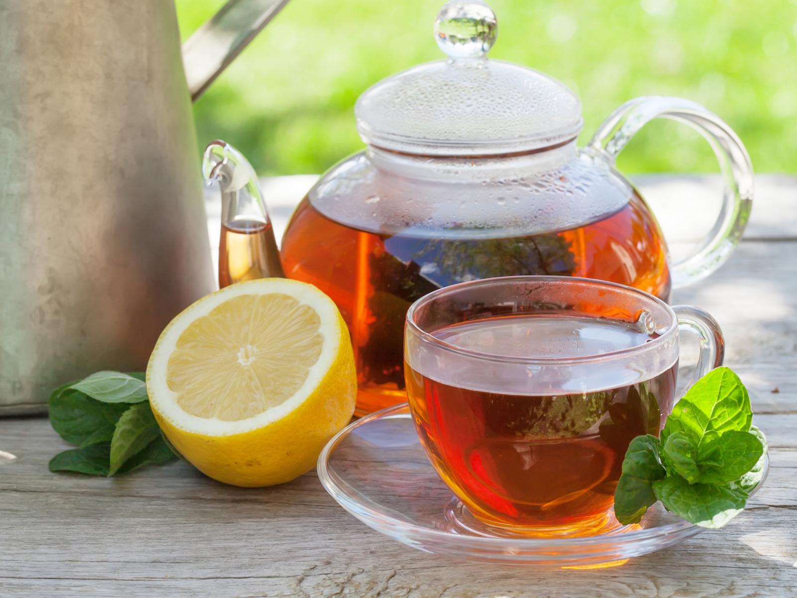 Обои Чайник с чаем на столе с чашкой и половиной лимона