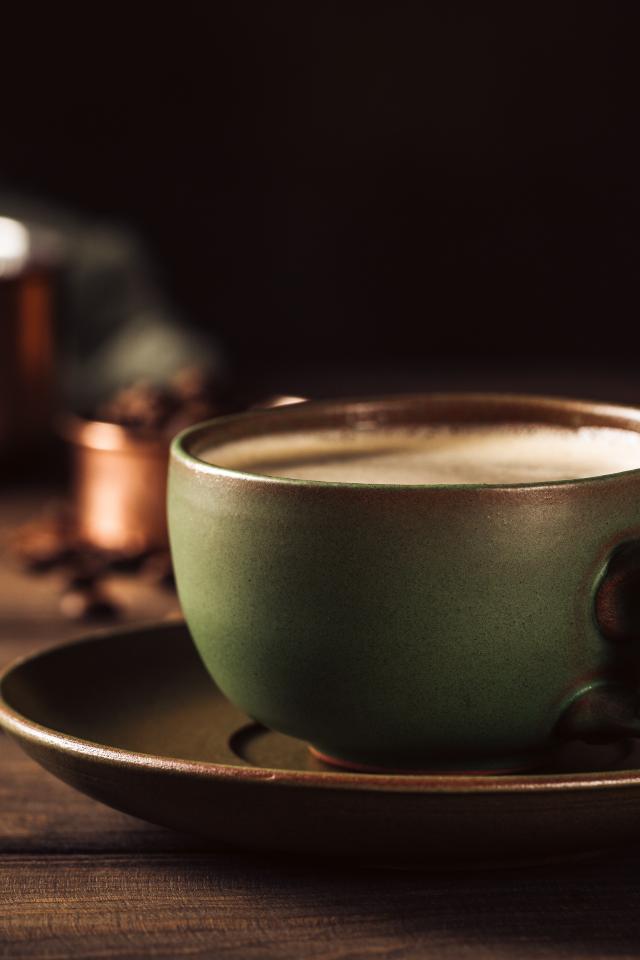Обои Большая чашка кофе на столе с кофейными зернами