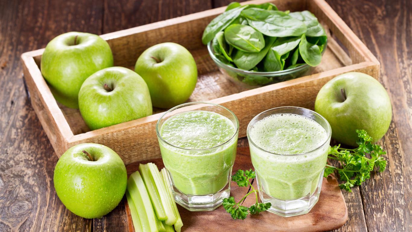 Обои Смузи на столе с зелеными яблоками и зеленью