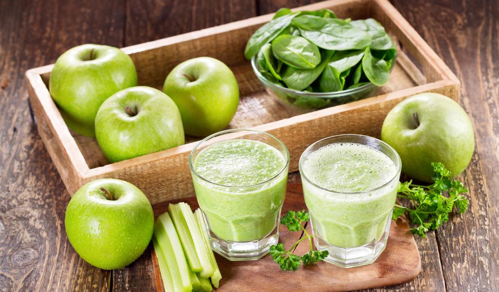 Обои Смузи на столе с зелеными яблоками и зеленью