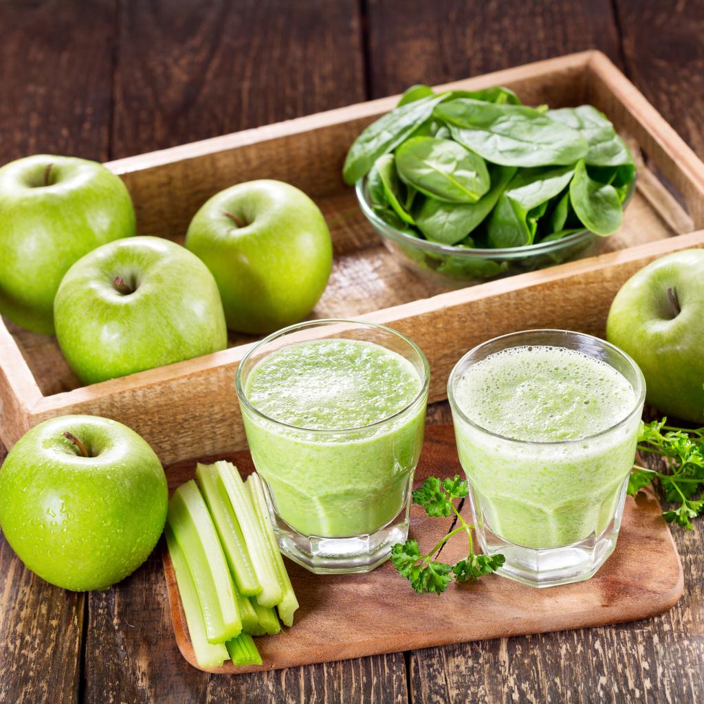 Обои Смузи на столе с зелеными яблоками и зеленью