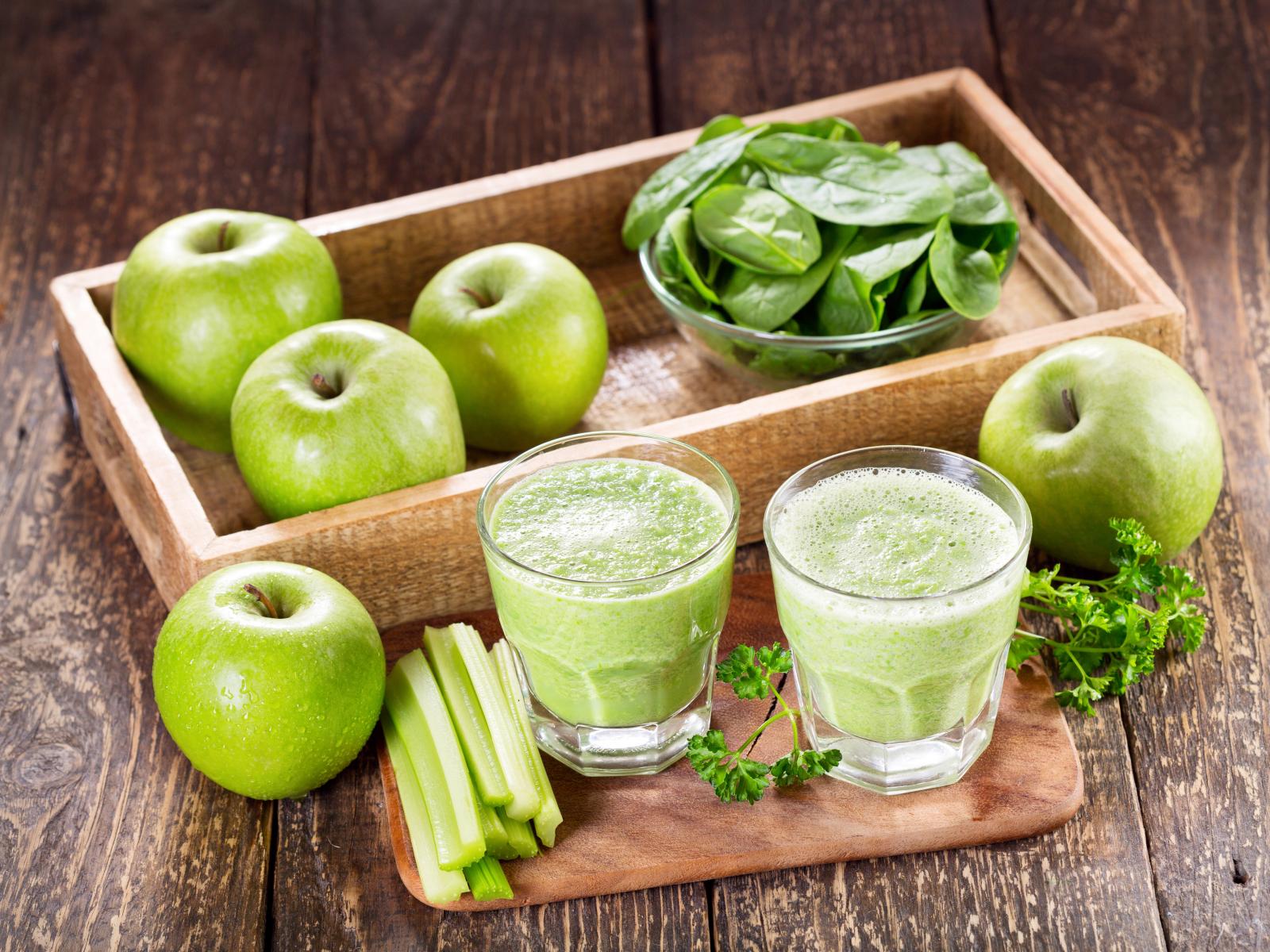 Обои Смузи на столе с зелеными яблоками и зеленью