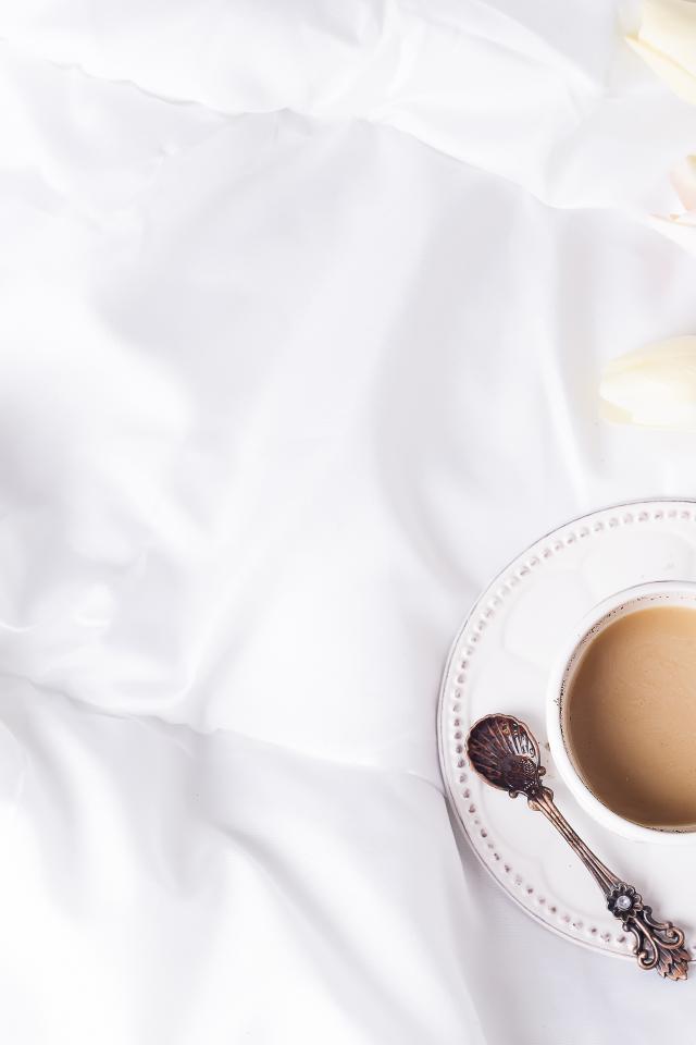 Обои Чашка кофе на белом покрывале с тюльпанами