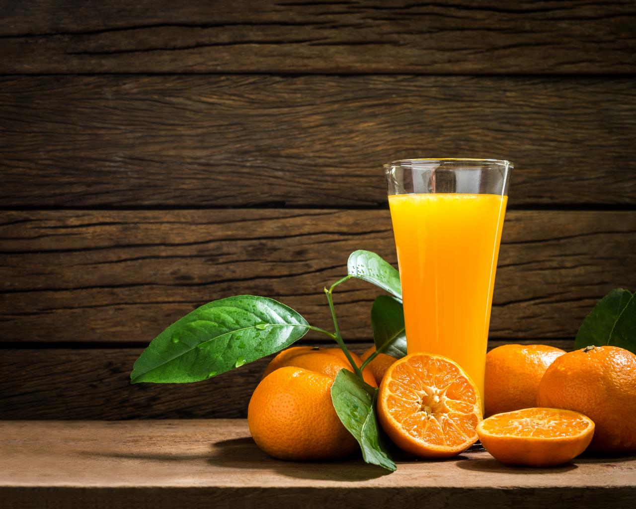 Обои Стакан апельсинового сока на столе с мандаринами