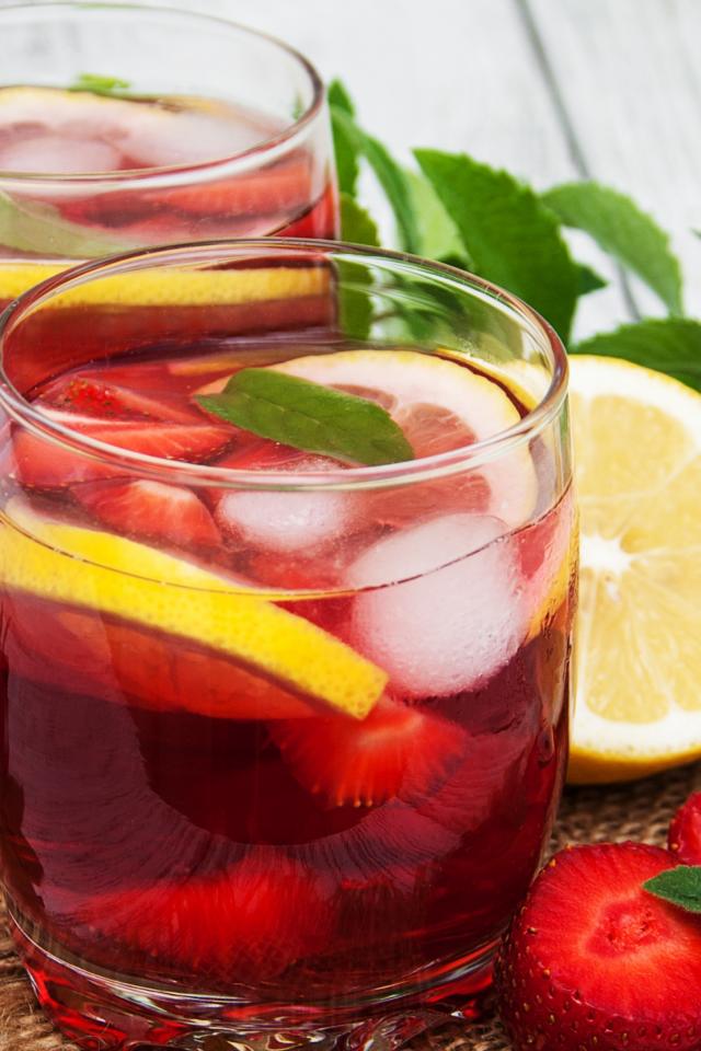 Обои Мохито в стаканах на столе с клубникой, лимоном и мятой