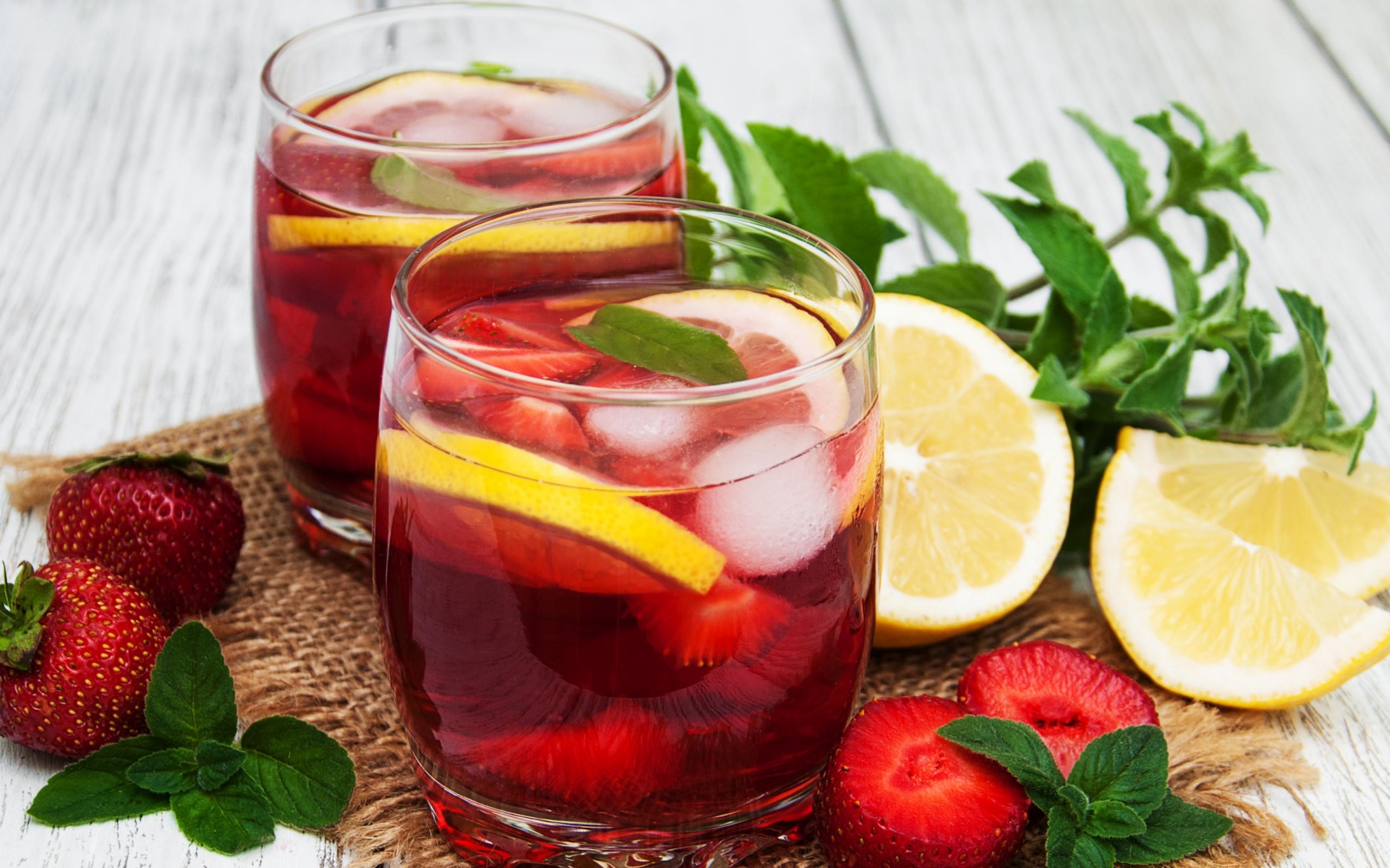 Обои Мохито в стаканах на столе с клубникой, лимоном и мятой