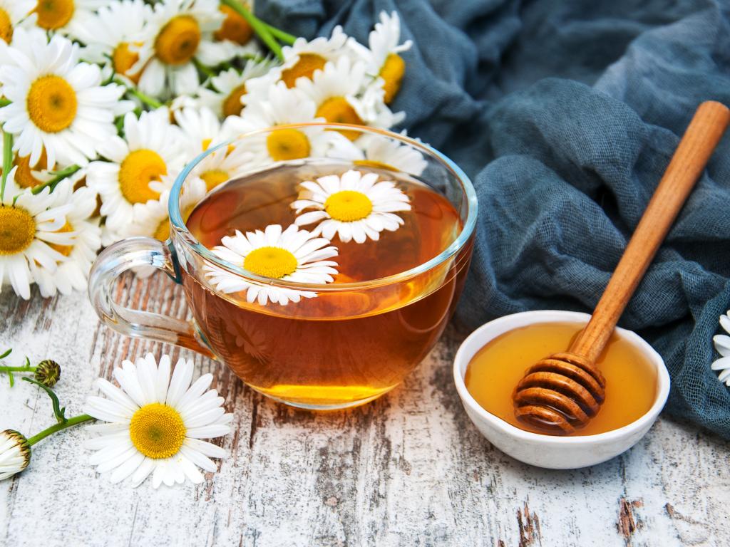 Обои Чашка чая на столе с медом и букетом ромашек