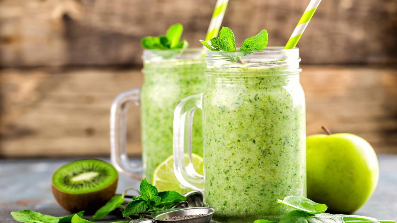 Обои Два зеленых смузи на столе с киви, мятой и зеленым яблоком