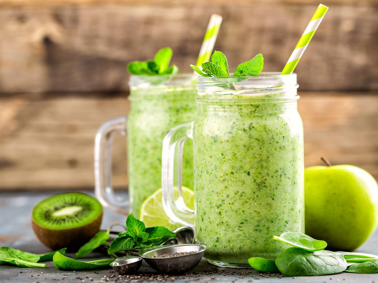 Обои Два зеленых смузи на столе с киви, мятой и зеленым яблоком