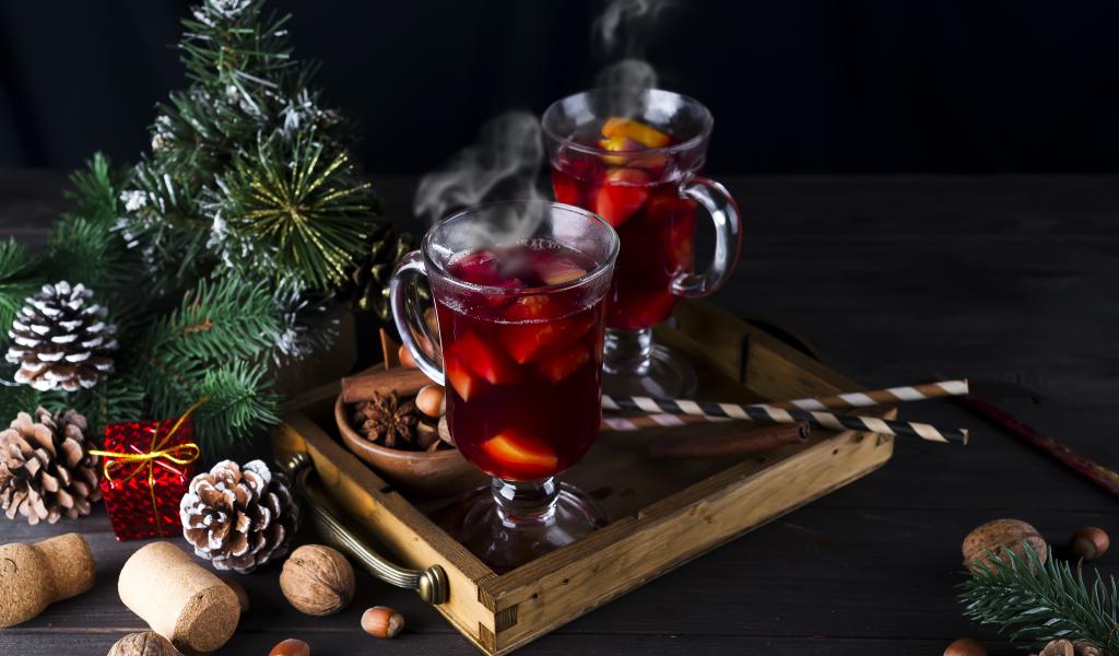 Обои Два стакана горячего глинтвейна на столе с еловой веткой