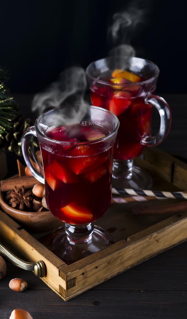 Обои Два стакана горячего глинтвейна на столе с еловой веткой