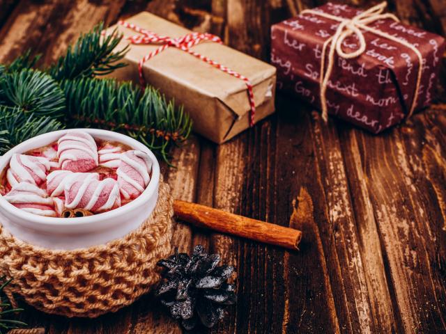 Обои Чашка какао с маршмеллоу на столе с подарками
