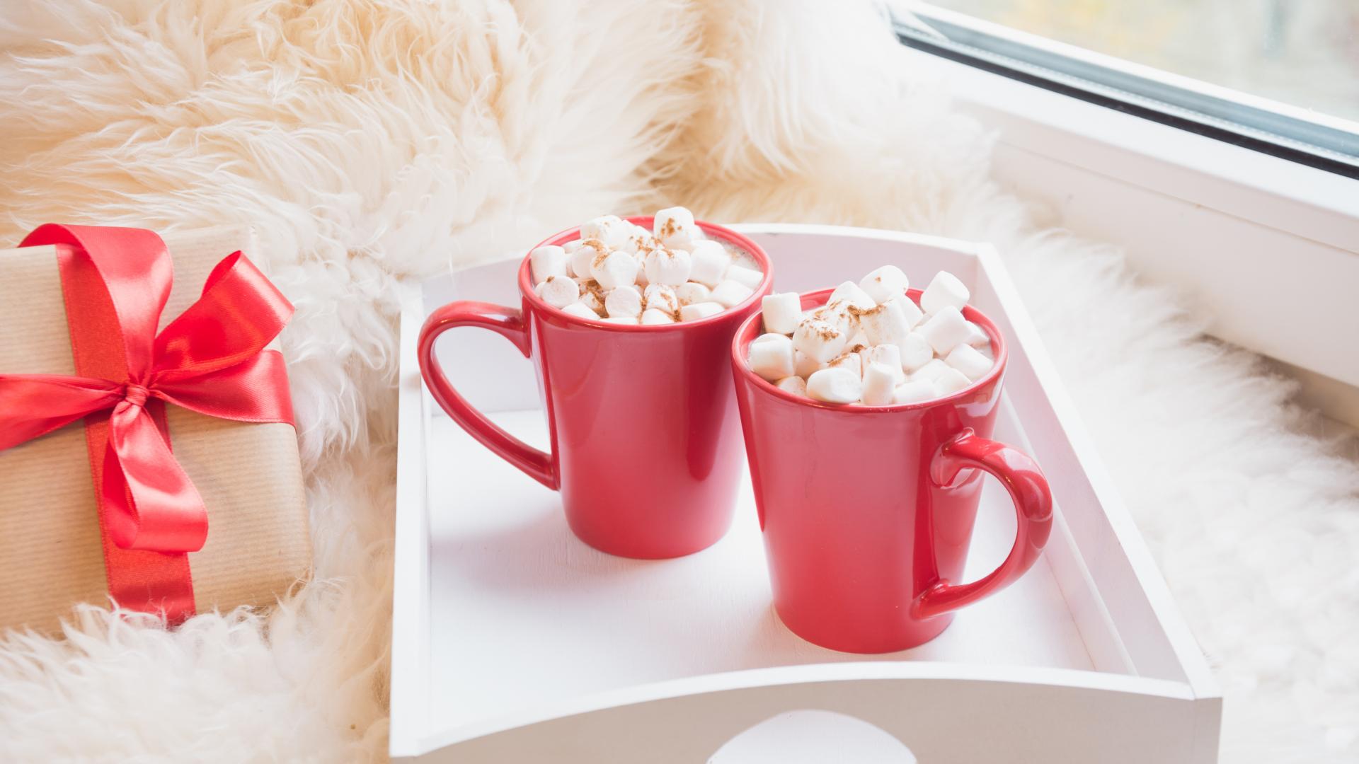 Обои Две красные чашки с маршмеллоу у окна