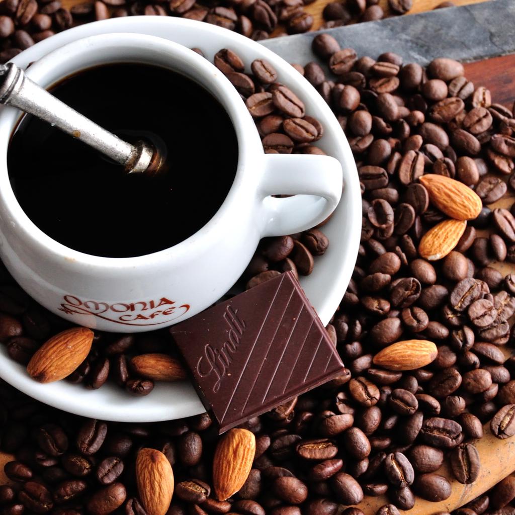 Обои Белая чашка кофе на столе с кофейными зернами