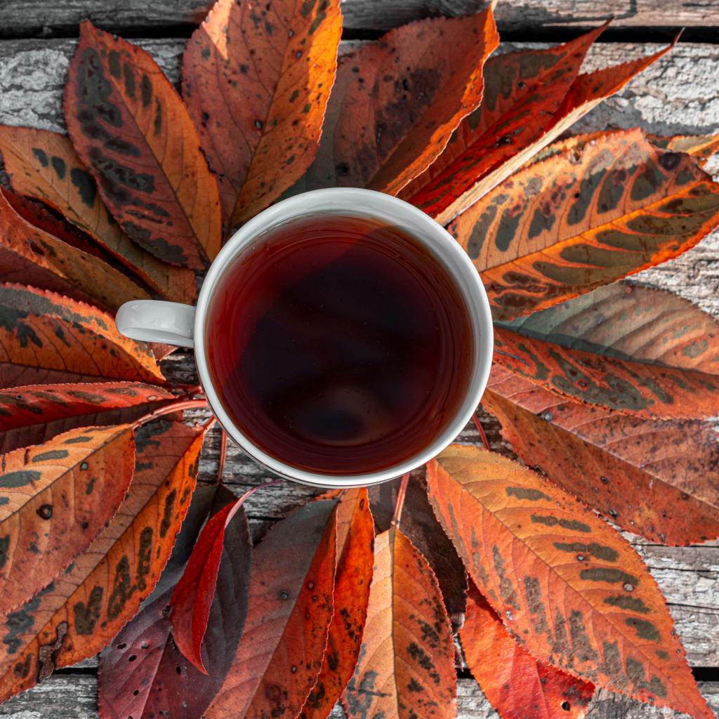 Обои Чашка чая на столе с желтыми листьями