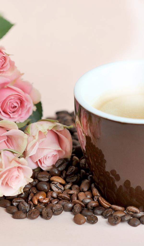 Обои Чашка кофе на столе с зернами и розовыми розами