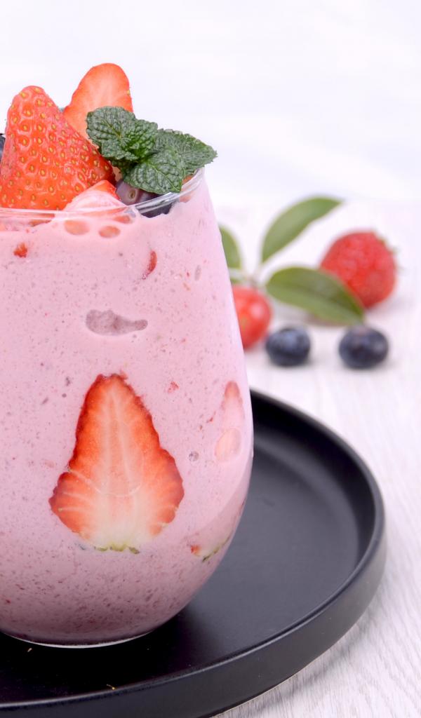 Обои Йогурт в стакане с ягодами черники и клубники