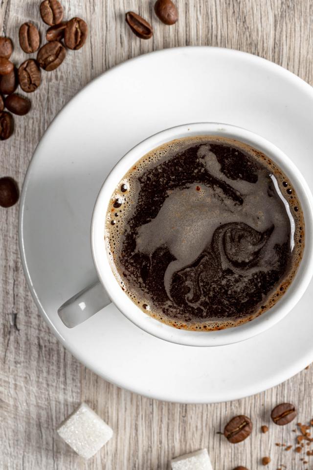 Обои Чашка кофе на столе с сахаром и кофейными зернами