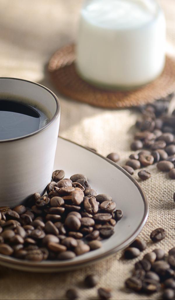 Обои Чашка крепкого кофе на столе с зернами