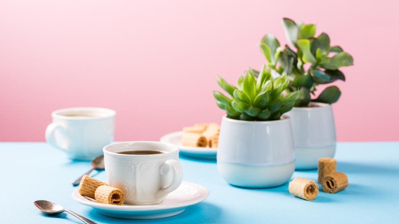 Обои Чашка кофе на блюдце с вафлями на столе с цветами