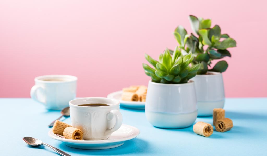 Обои Чашка кофе на блюдце с вафлями на столе с цветами