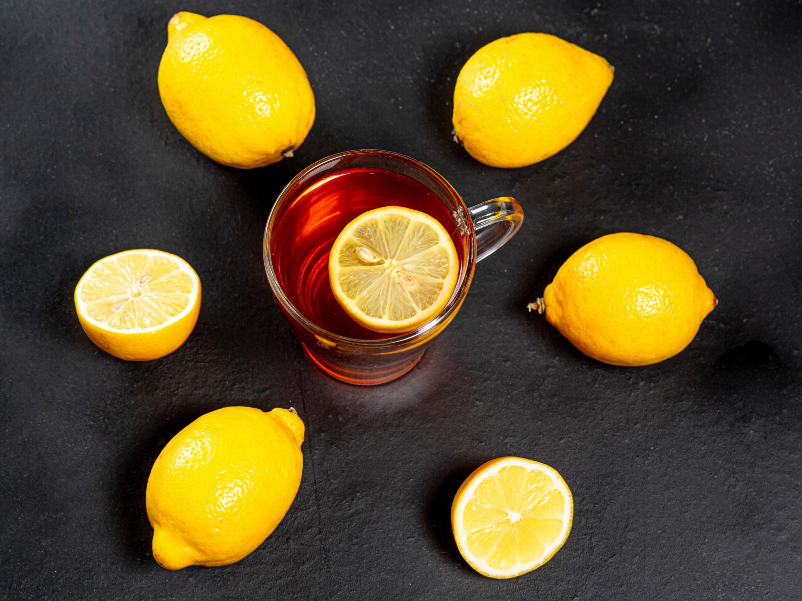 Обои Стеклянная чашка чая с лимоном на сером столе