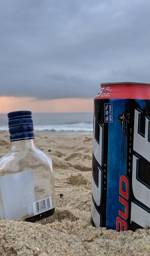 Обои Бутылка пива и бутылка водки на песке у моря