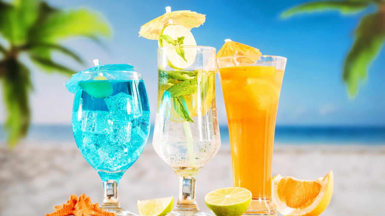 Обои Три вкусных тропических коктейля стоят на пляже