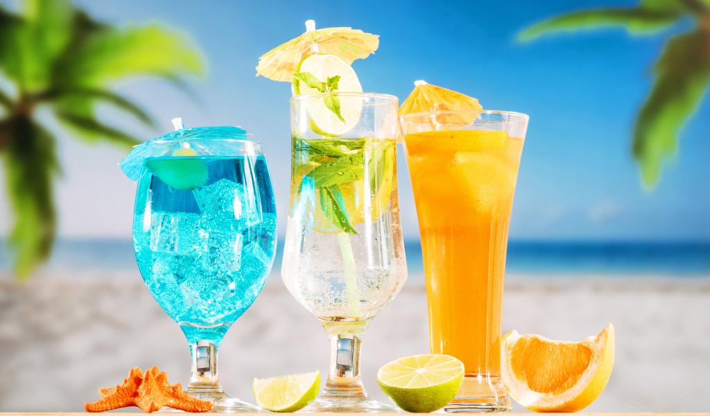 Обои Три вкусных тропических коктейля стоят на пляже
