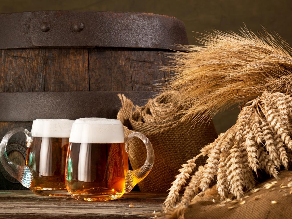 Обои Два бокала пива на столе с колосьями пшеницы и бочкой