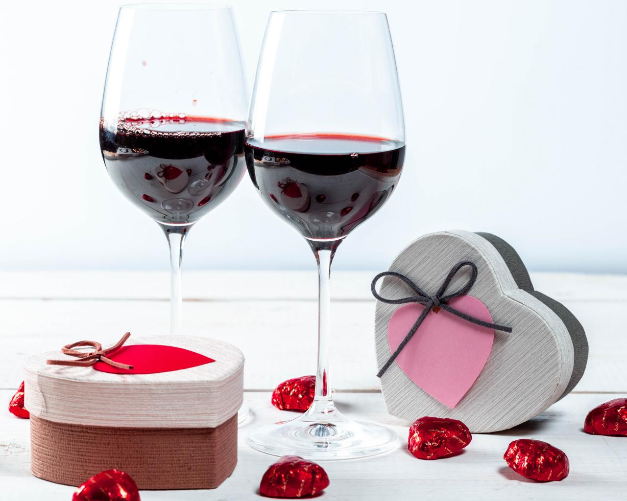 Обои Две коробки с конфетами в форме сердца на столе с бокалами